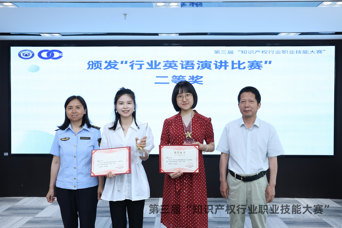 ▲黃建軍二級巡視員、張芳英局長為行業(yè)英語演講比賽二等獎頒獎(左二為徐欣)