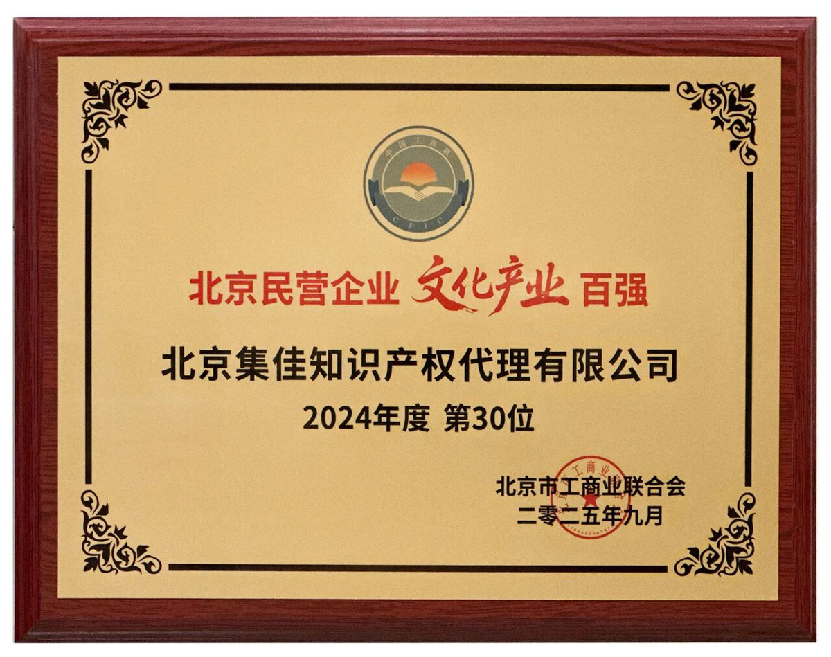 2025年9月19日,北京市工商業(yè)聯(lián)合會(huì)重磅發(fā)布 “2025北京民營(yíng)企業(yè)百?gòu)?qiáng)榜單”。北京集佳知識(shí)產(chǎn)權(quán)代理有限公司連續(xù)第三年榮登“北京民營(yíng)企業(yè)文化產(chǎn)業(yè)百?gòu)?qiáng)”榜,位列第30位,較上年排名大幅提升32個(gè)名次,充分彰顯了集佳卓越的綜合實(shí)力與良好的社會(huì)形象。