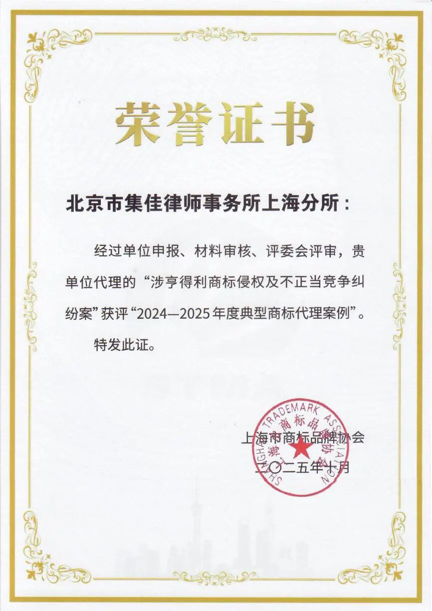 集佳上海分所榮獲“服務誠信獎”“知識引領獎”、代理案件榮獲“2024-2025年度典型商標代理案例”等多項榮譽